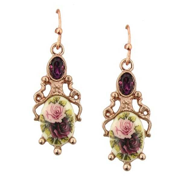 These elegant earrings are brimming with Victorian romance. The rose gold tone frame is carved in a rich and intricate silhouette. At the top a large faceted amethyst color crystal is set, perfectly accenting the shades of the floral design below. The drop stone is ivory color and embossed with a faux decoupage rose print. The roses are rendered in delicate pink and rich burgundy hues.