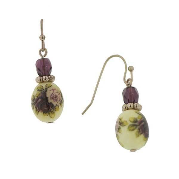 Versatile and romantic these lovely drop earrings are sure to become favorites. An amethyst tone accent bead rests above a simulated porcelain accent with a rose motif.