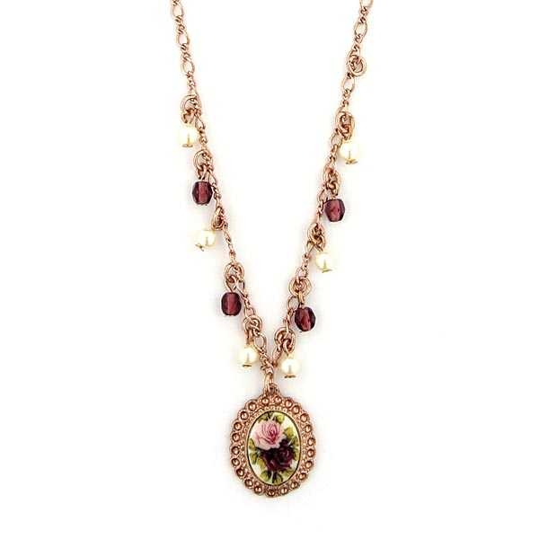 Delicate and feminine, this is a classic 1928 design. Lovely suspended beads in simulated pearl and amethyst color alternate along a rose gold tone chain. The pendant is set in a gleaming filigree frame and has a floral motif resembling decoupage.